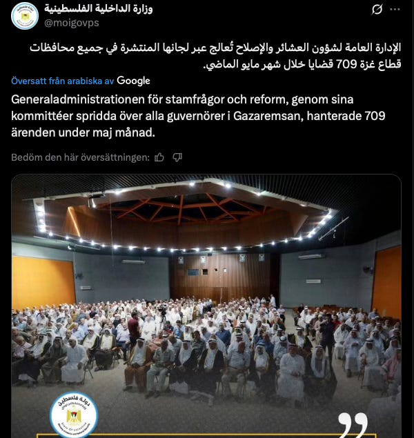 Hamas har i ett försök att inkorporera alla klaner i staten inrättat en officiell förvaltningsenhet eller myndighet inom inrikesministeriet, “Generaldirektoratet för klan- och försoningsärenden” (på arabiska: الإدارة العامة لشؤون العشائر والإصلاح.) Allt sådant här är offentligt och myndigheten finns både på Facebook och X.